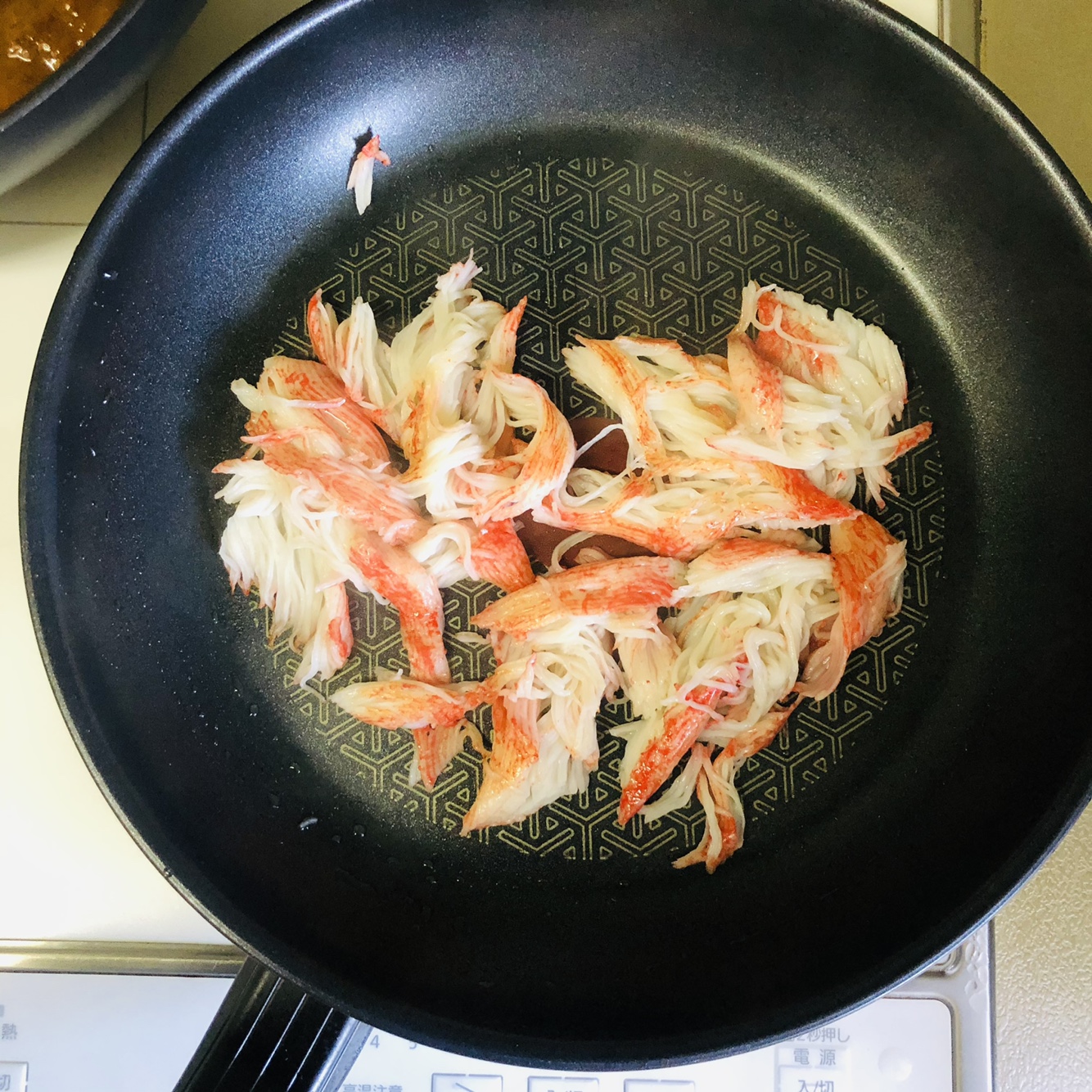 2. 식용유를 두르고 팬을 달궈 준다음 게맛살이 노릇해질 때까지 구워줍니다.