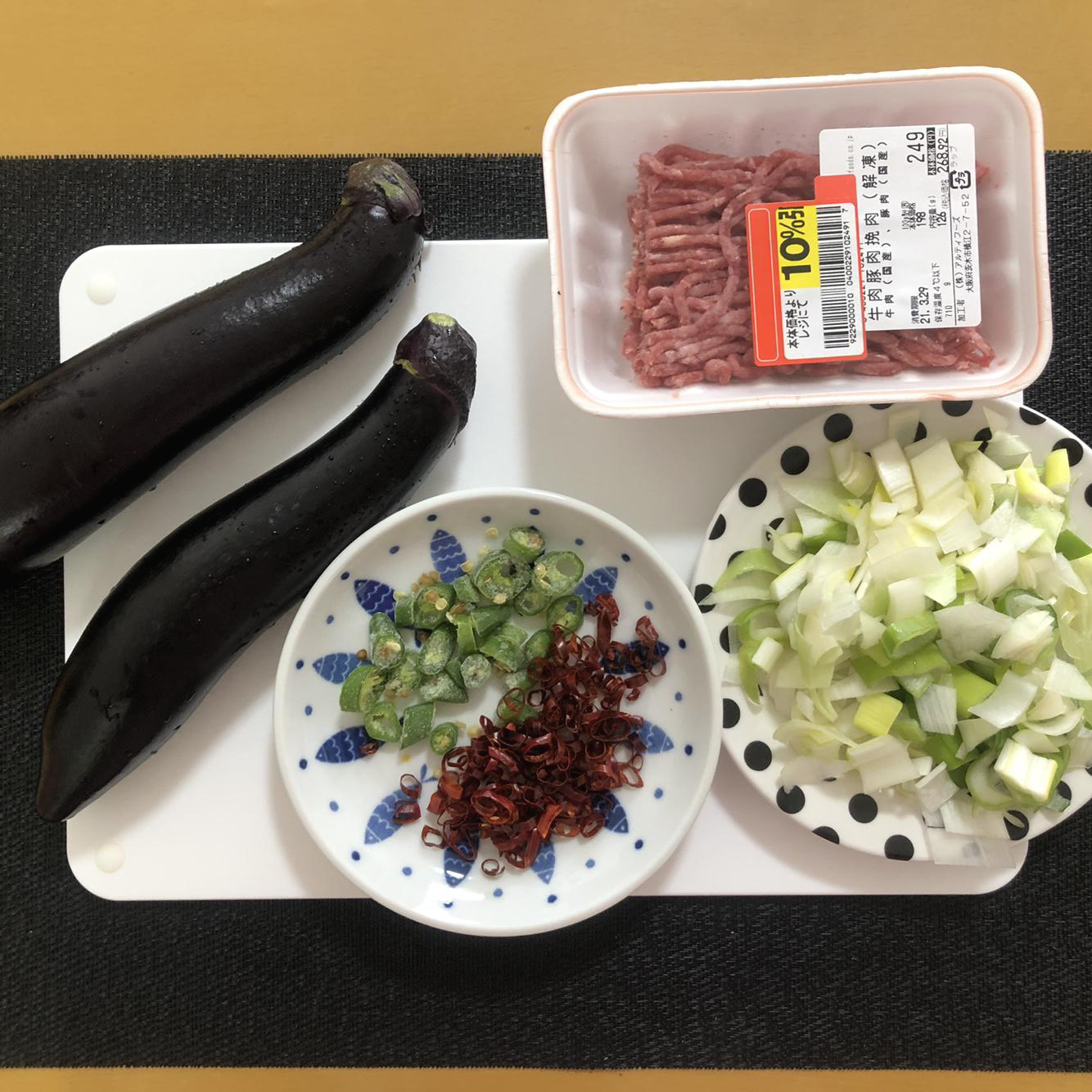 재료 : 가지 2개, 다짐육 120g, 청고추 1개, 홍고추 1개, 대파 -전분, 소금(가지 튀길 때 필요)