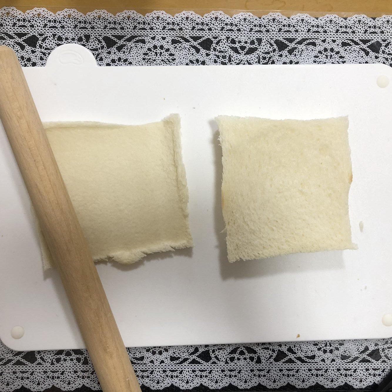 1. 식빵 테두리는 칼로 잘라준 후, 두 장 중에 한 장만 밀대로 얇게 밀어주세요.
