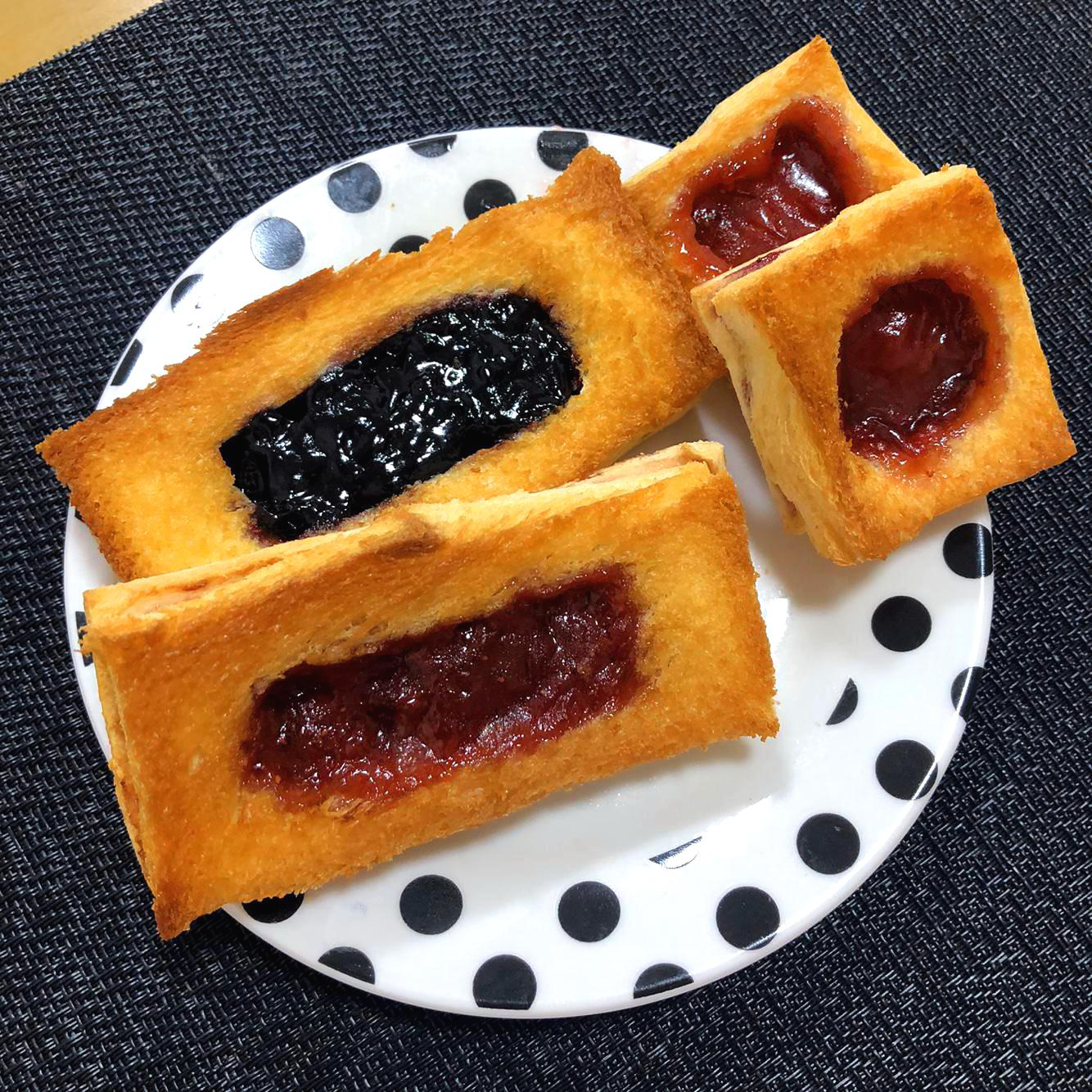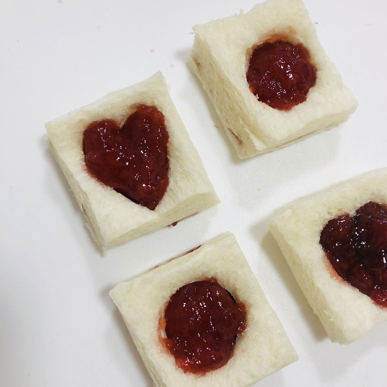 식빵 4장으로 직사각형 모양 2개, 정사각형 모양 4개 만들었습니다.