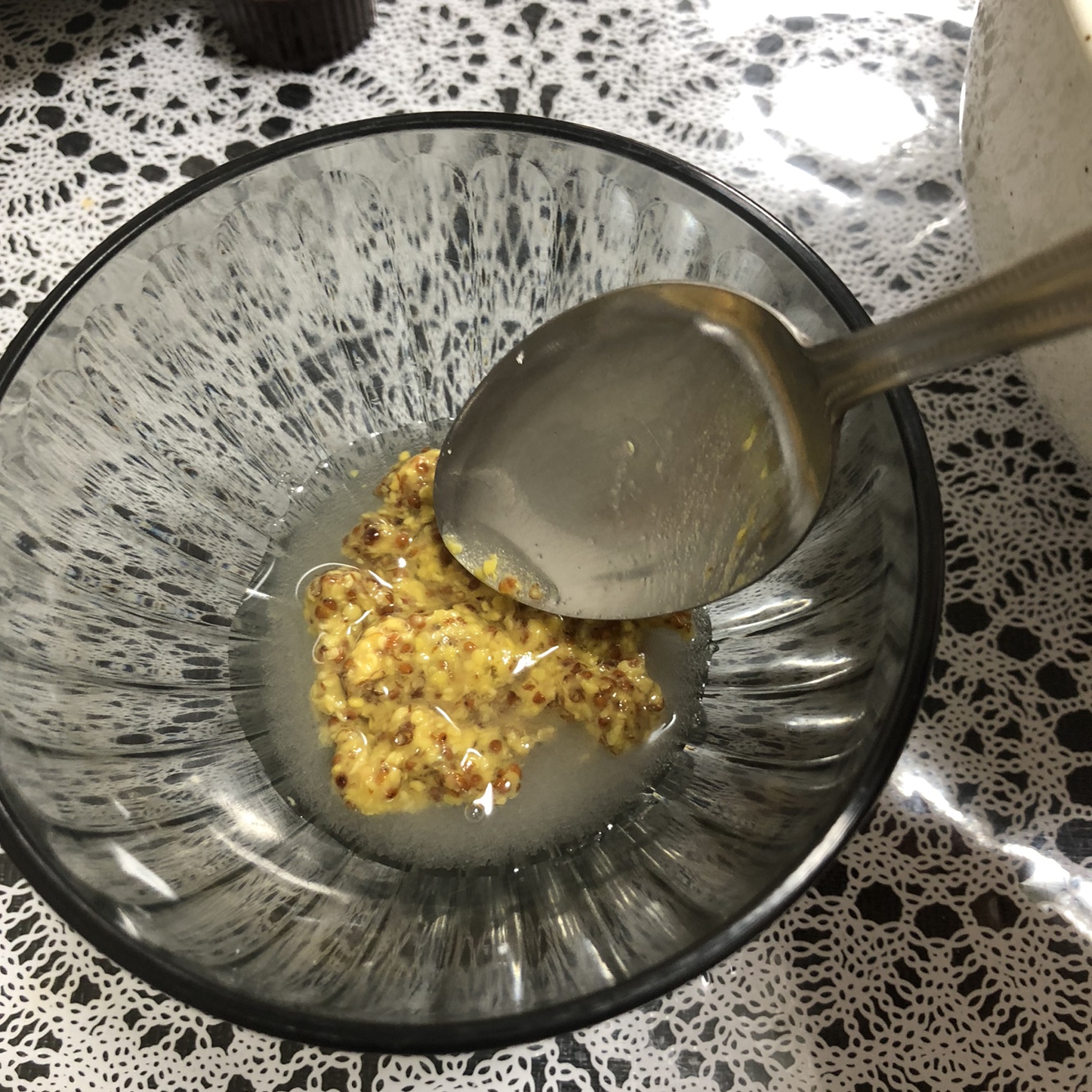 3. 레몬즙 1스푼, 설탕 0.5스푼, 홀그레인 머스터드 1스푼을 잘 섞어줍니다.