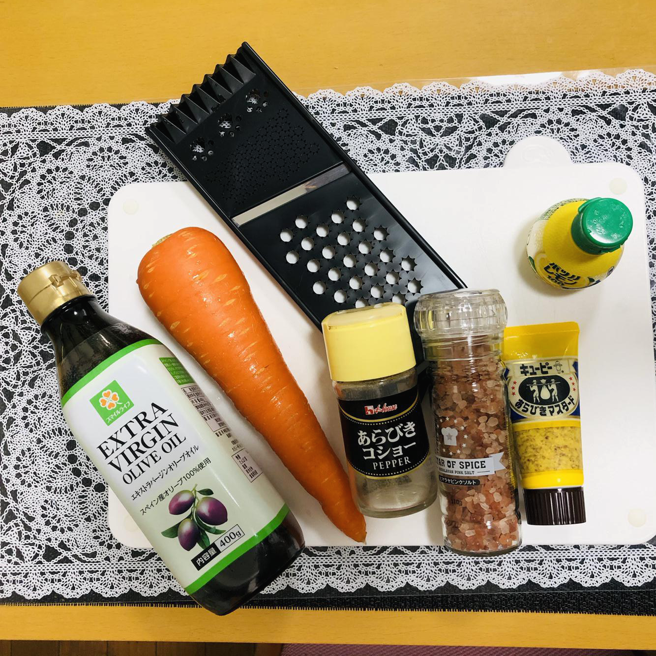 재료 준비 : 당근 1개 , 올리브 오일 1.5스푼, 설탕 0.5스푼, 레몬즙 1스푼, 고운 소금 1-1.5 티스푼, 홀그레인 머스터드 1스푼