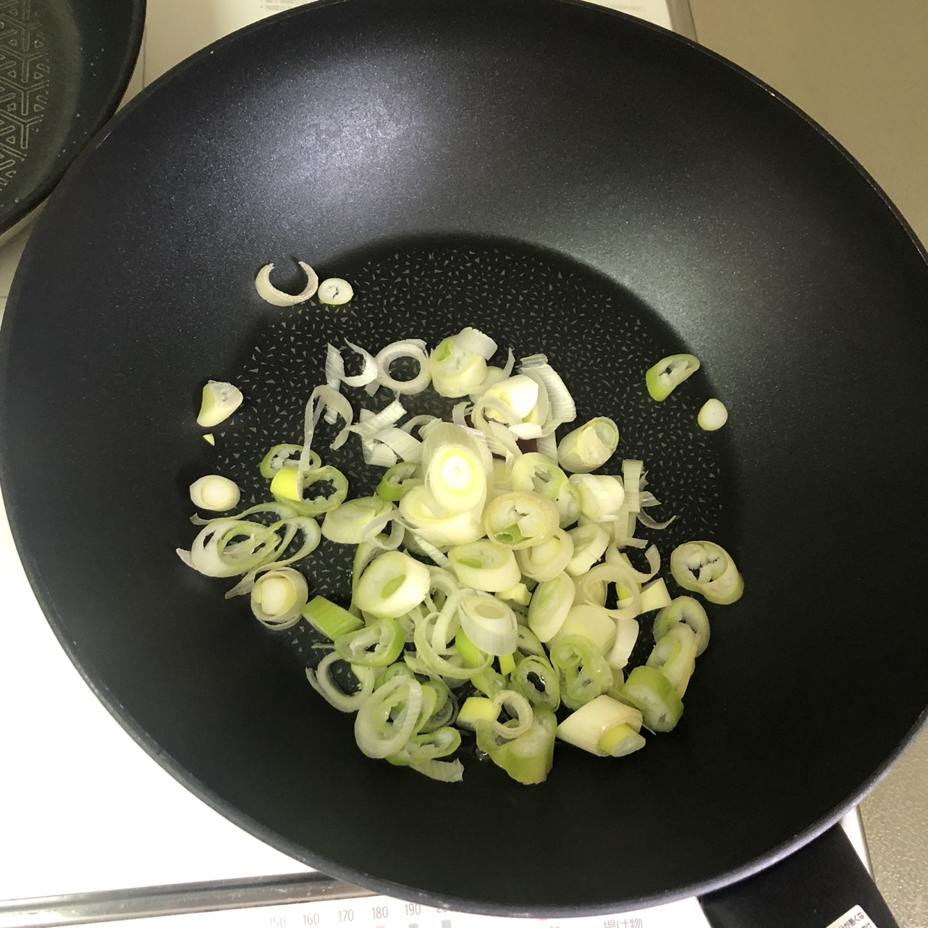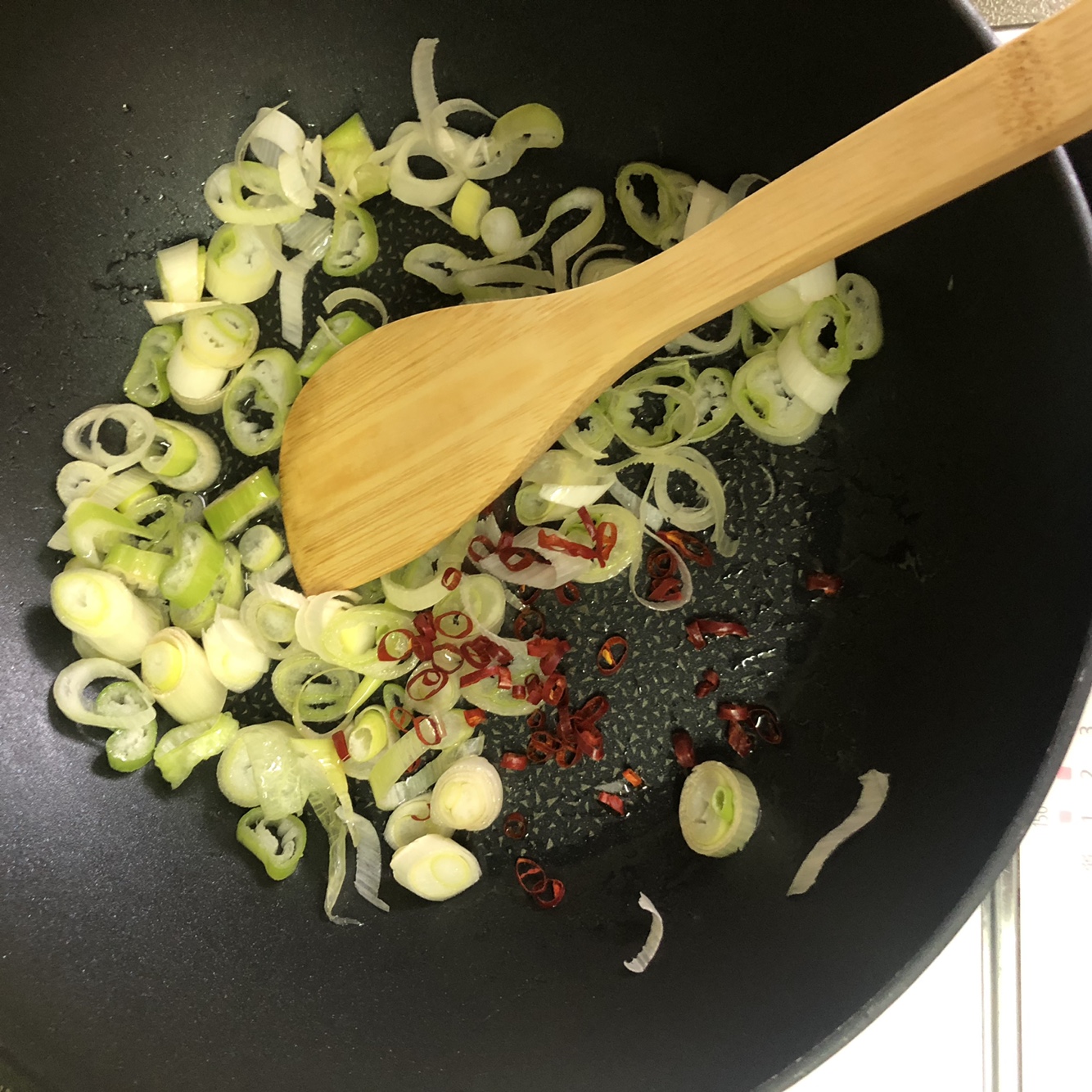 3. 팬에 식용유를 두르고 파를 넣고 볶아 줍니다.