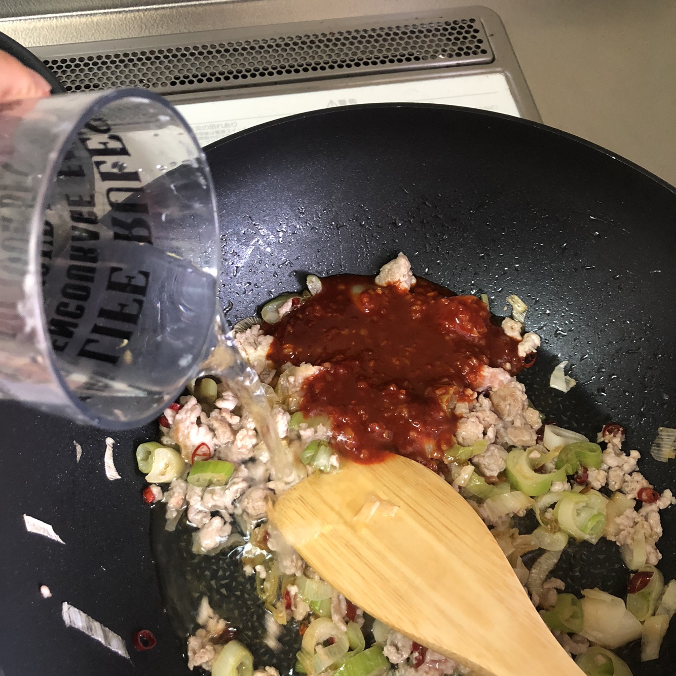 어느 정도 볶아주다 다짐육을 넣고 볶아주세요. +후추 톡톡톡