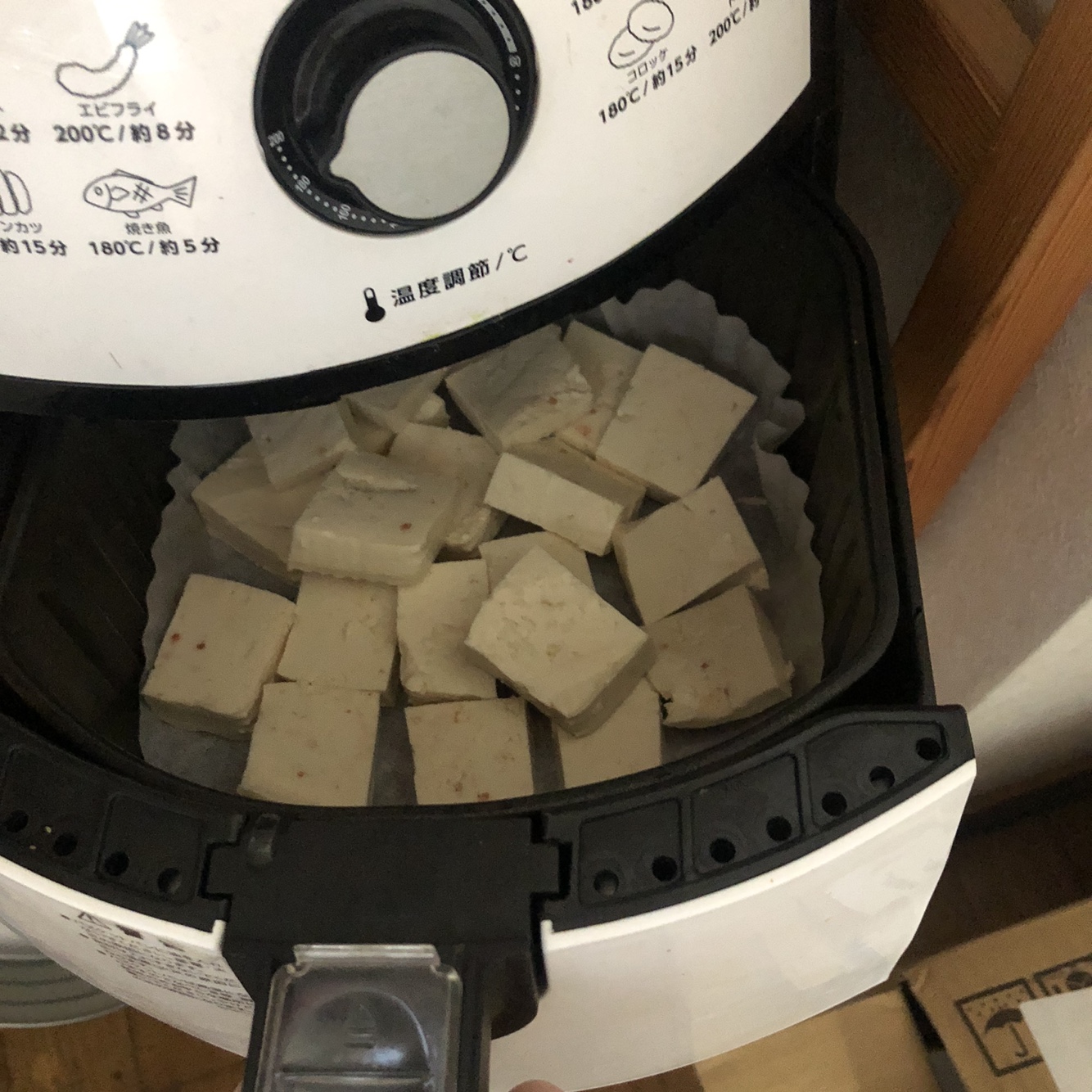 1. 두부는 적당한 크기로 썰어서, 에어프라이어에 돌려줍니다.