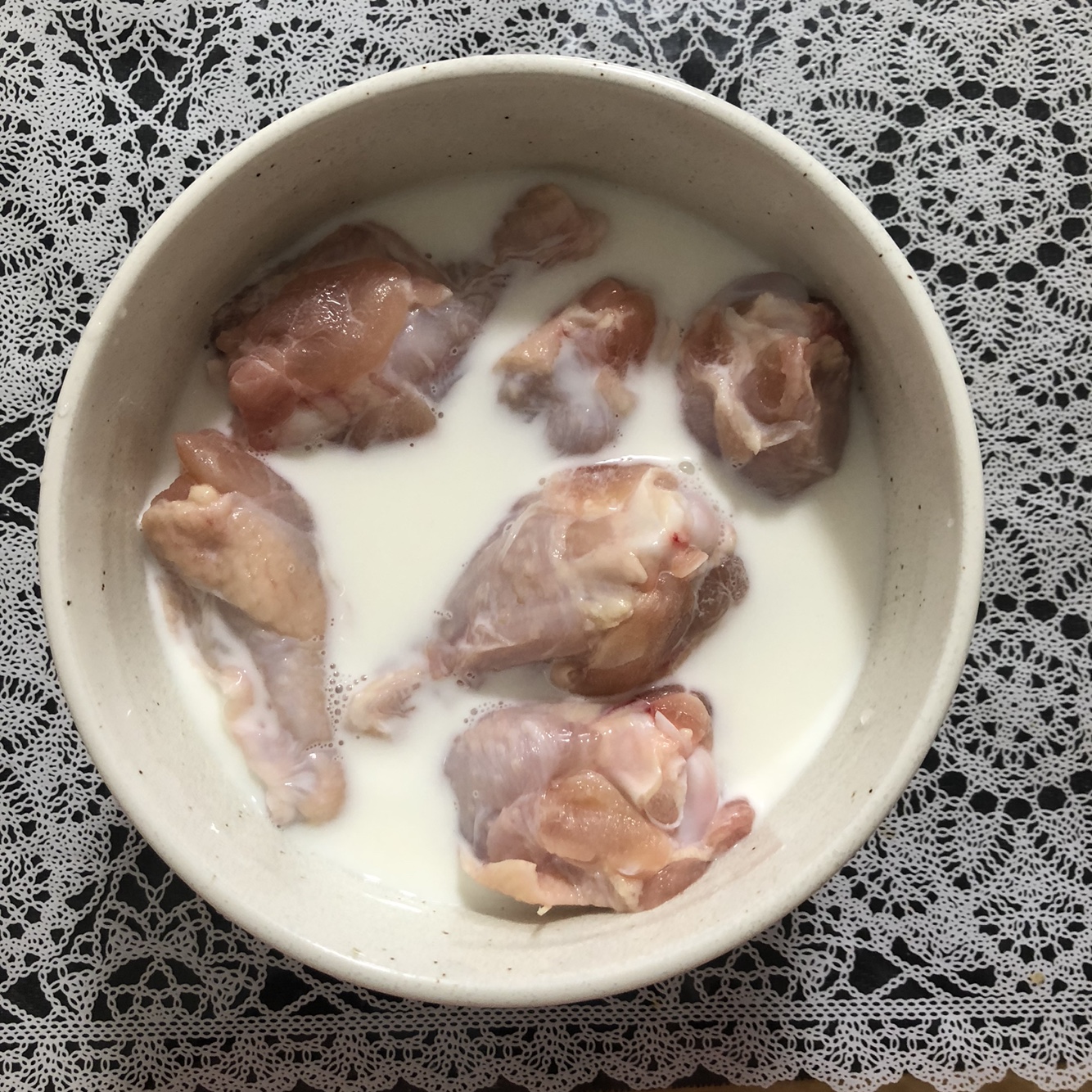 1. 닭다리를 깨끗하게 씻은 후 , 우유에 20분 정도 담가 둡니다.